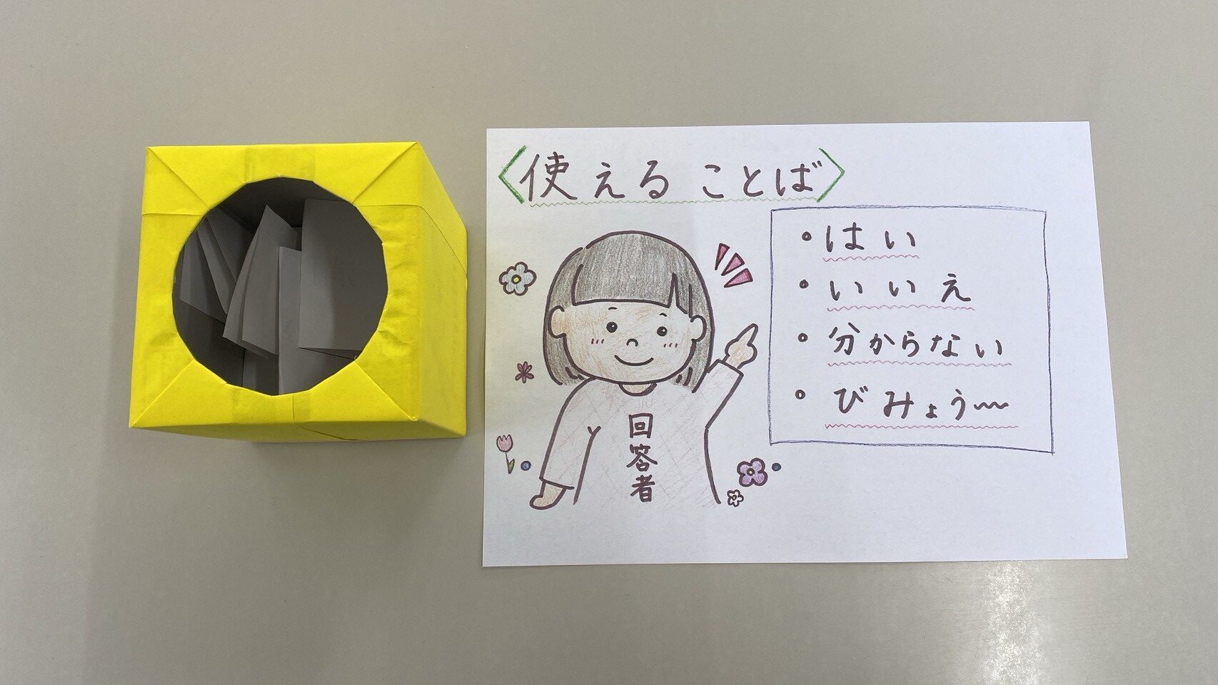 周りの人たちはお題を引いた人に質問ししますが、“はい”、“いいえ”などの限られた単語でしか答えられません。