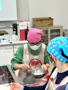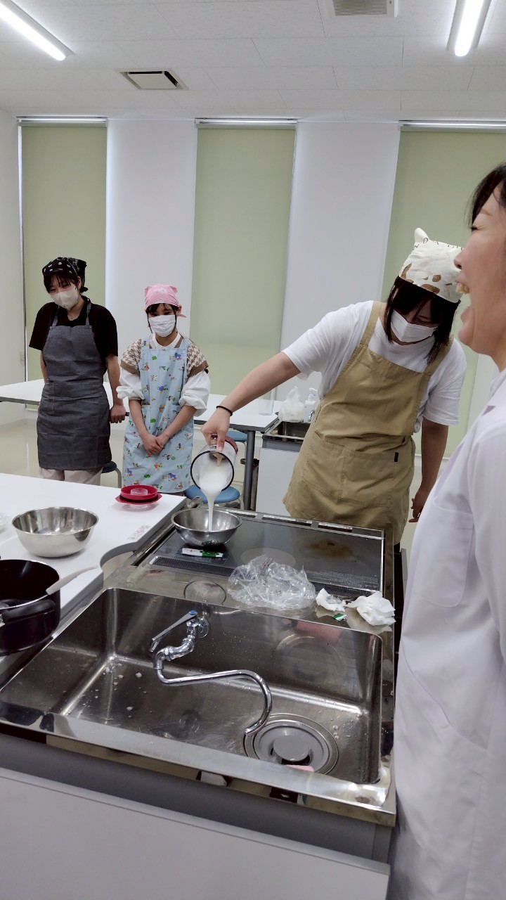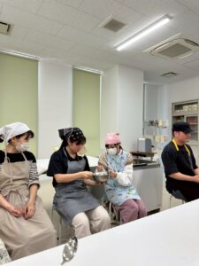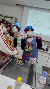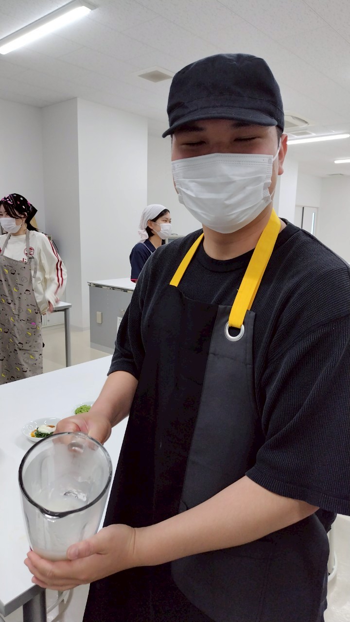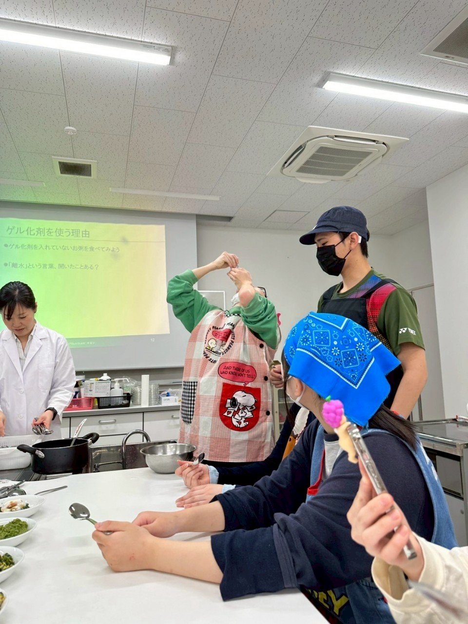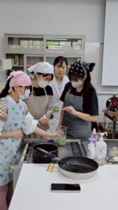 栄養学を教えて下さるのは、第一工科大学の森園先生です。第一弾は、嚥下調整食とお粥ゼリーの調理・試食でした。