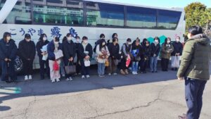 見送りの皆さんにお礼をし、バスに乗り込んでいく3年生。