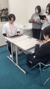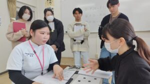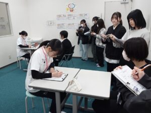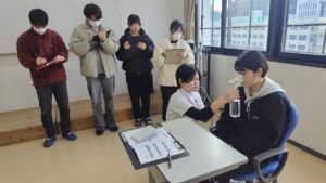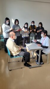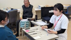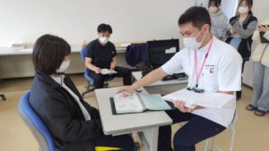 模擬患者さんは3年生です。長期の実習を終え、国試対策ラストスパートの3年生、後輩のために快く患者さん役を引き受けてくれました(●´ω`●)