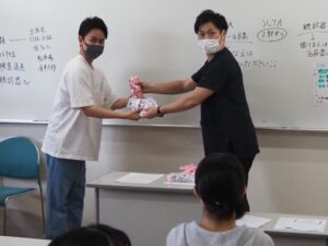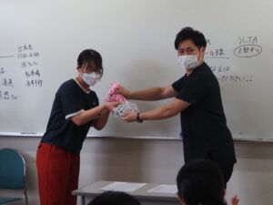 そして、奄美大島へ行く2人が代表で担任からネームを受け取りました。