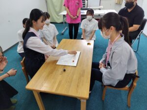 学生同士でST役、子どもさん役に分かれ訓練の様子の見本をみました。