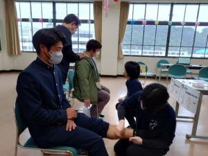 学生を中心に、首の動きや気になる不調に合わせて経穴を絞って押圧や刺さない鍼で体の変化を体験していただきました。