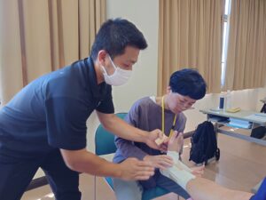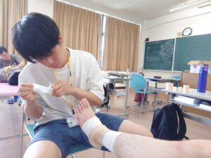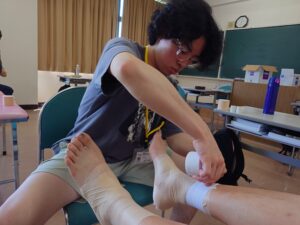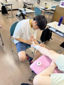 スポーツによるケガで最も多い、足首の捻挫に対するテーピングを学びました