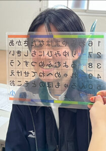 道具を使って目線で言葉を伝えます