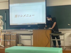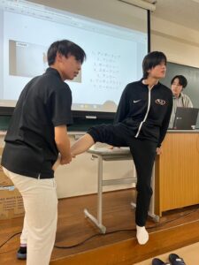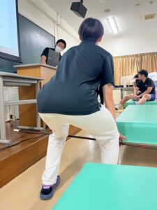 最後に再発防止のトレーニングメニュー(筋トレ)を学生自身が検討し、モデル患者に行いながら説明を行います。