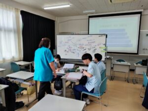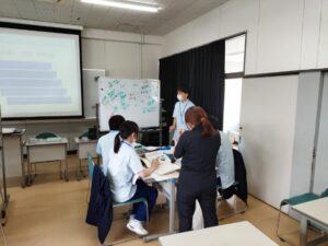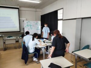 学生は前回までの講義で『知識』の補足学習に取り組んでおり、本日はこの知識を基に実施すべき評価項目を書き出して、どのように実施すべきか『技術』『態度』についてシェア学習を行いました。この後に実習室へ移動して実技練習にも取り組みました。
