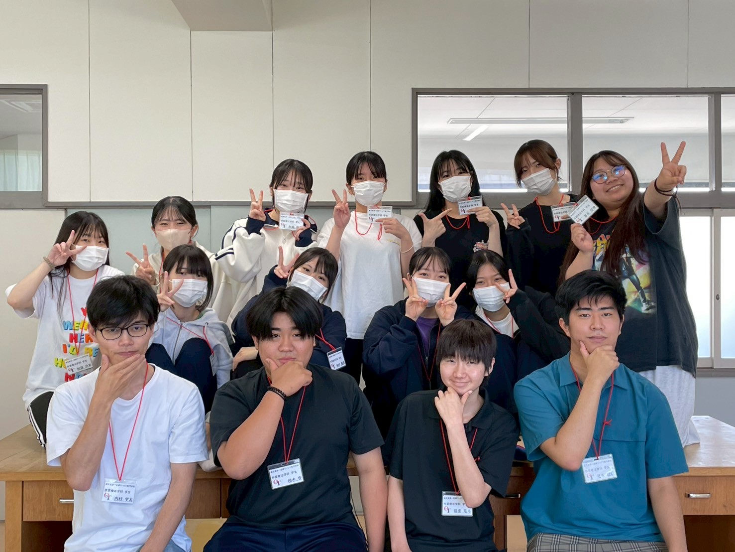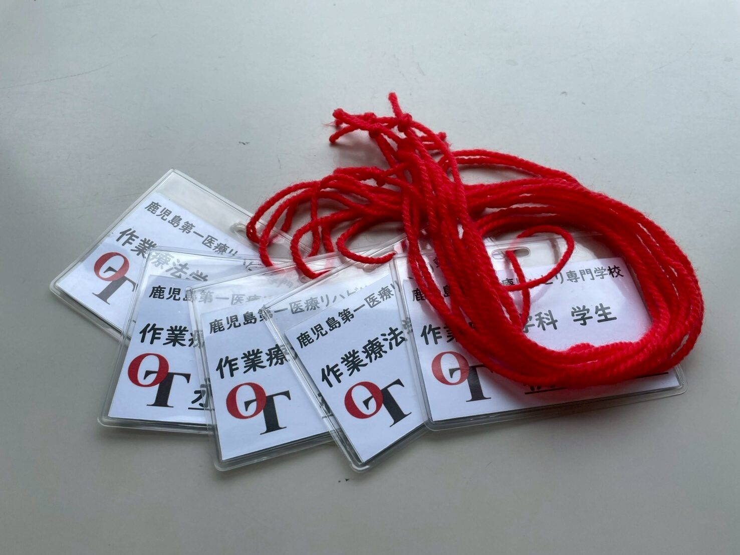 ▲作業療法学科の支援学生さんは学科ポロシャツを着て,赤い毛糸をヒモにした名札をさげています.