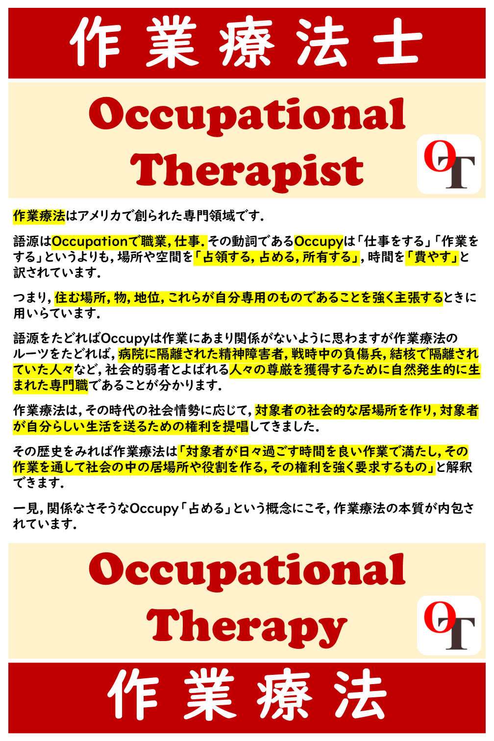 作業療法 の英語表記である Occupational Therapy (オキュペイショナル セラピー)の略です.覚えてくださいね.