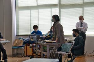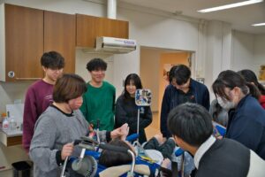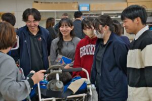 保護者の方以外にも、医療的ケア児さん、その児童が通っている放課後等デイサービスのスタッフ、宮崎県都城市重症心身障害児者支援部会員の方々が来校してくださり、ちょっと緊張気味の学生さん。