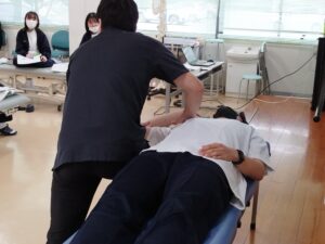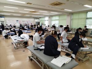 池田先生は作業療法学科 2年生の学生へ、スライドや配布プリントを使用して分かりやすく説明し、実際にデモンストレーション→学生同士で実施と、座学と演習を組み合わせながら講義を進めていました。