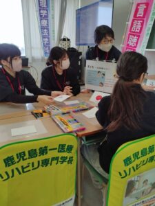 鹿児島第一医療リハビリ専門学校では、それぞれの専門職を活かしながらリハビリや施術を行う「第一リハビリ病院」と称して5つの学科の仕事を疑似体験して頂きました。