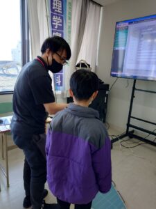 ・身体の重心の位置や移動を調べることの出来る重心動揺計を使用して、片足立ちの検査や風船割りゲームを体験していただきました。