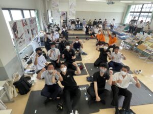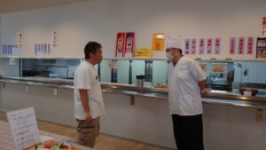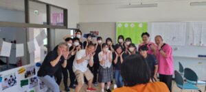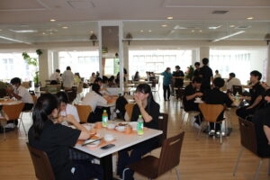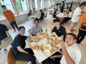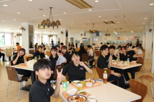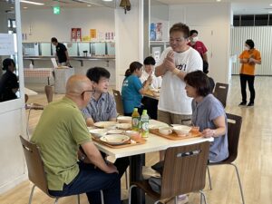 学園の食堂でたくちゃん、参加者、支援学生、教員、